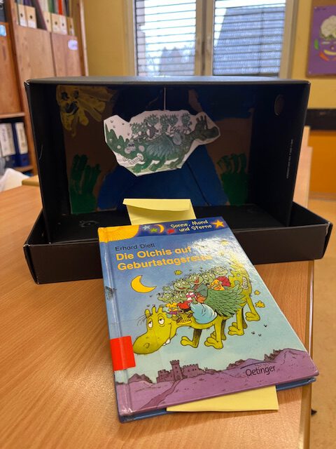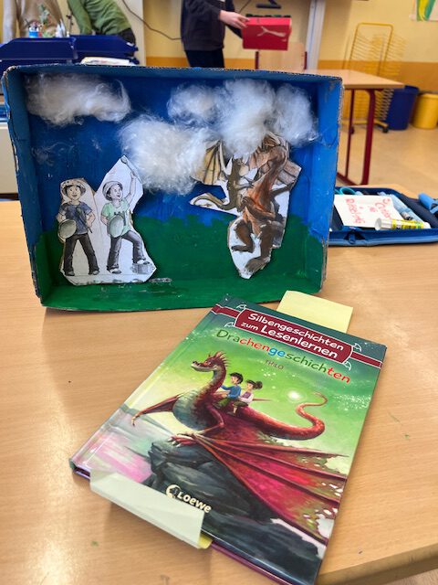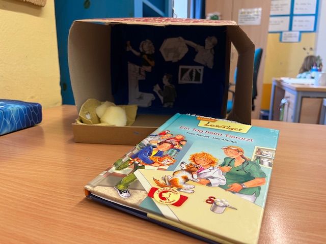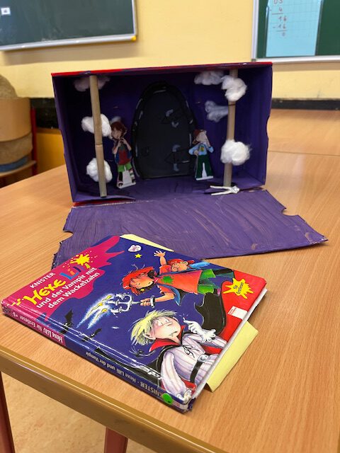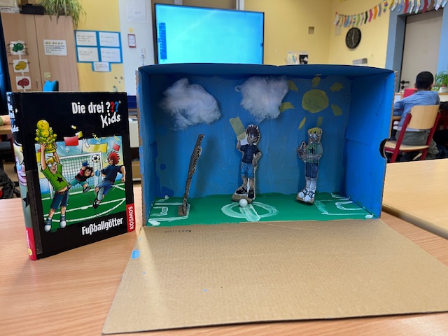 Die fertigen Buchkisten haben wir uns gegenseitig im Rahmen einer Buchpräsentation vorgestellt. Während der Präsentation haben wir die wichtigen Informationen, wie Autor und Titel, zu unserem Buch genannt. Anschließend hat jeder eine kurze Textstelle vorgelesen und seine Buchkiste gezeigt.
